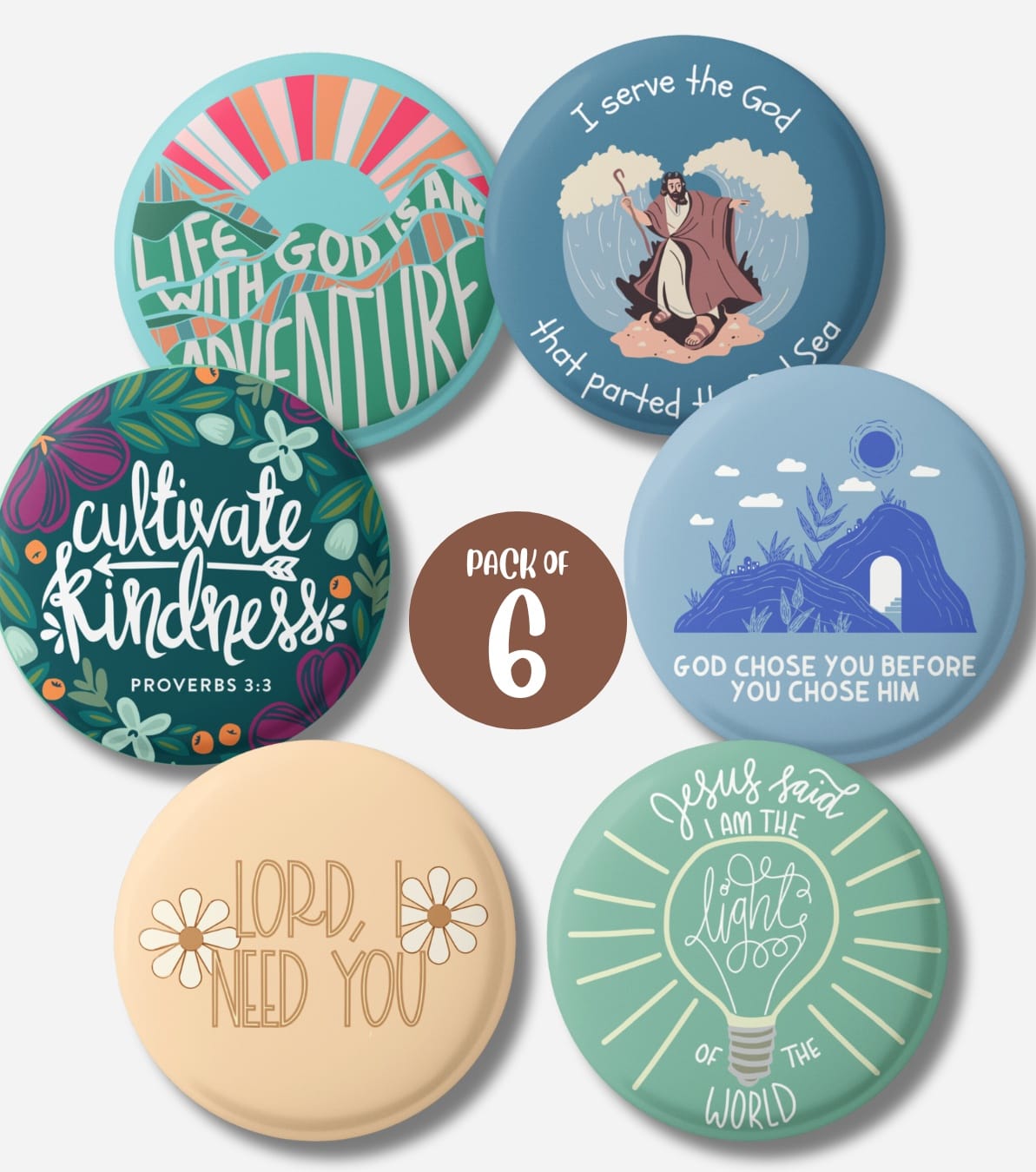 + Free ShippingPack of 6 Christian button badges with Scripture-inspired messages. Perfect for gifting, daily encouragement, and expressing your faith. Premium quality by HopeLightStore